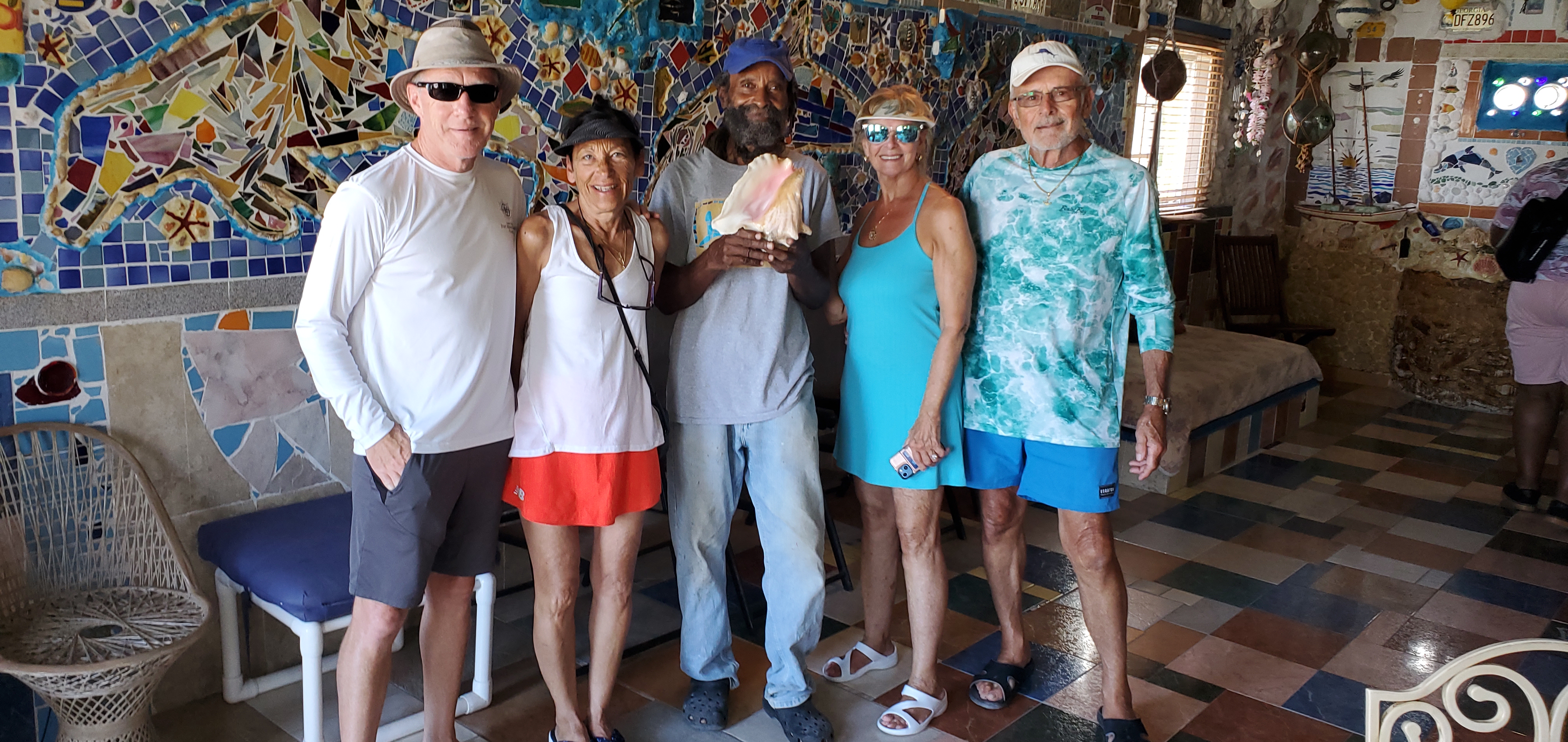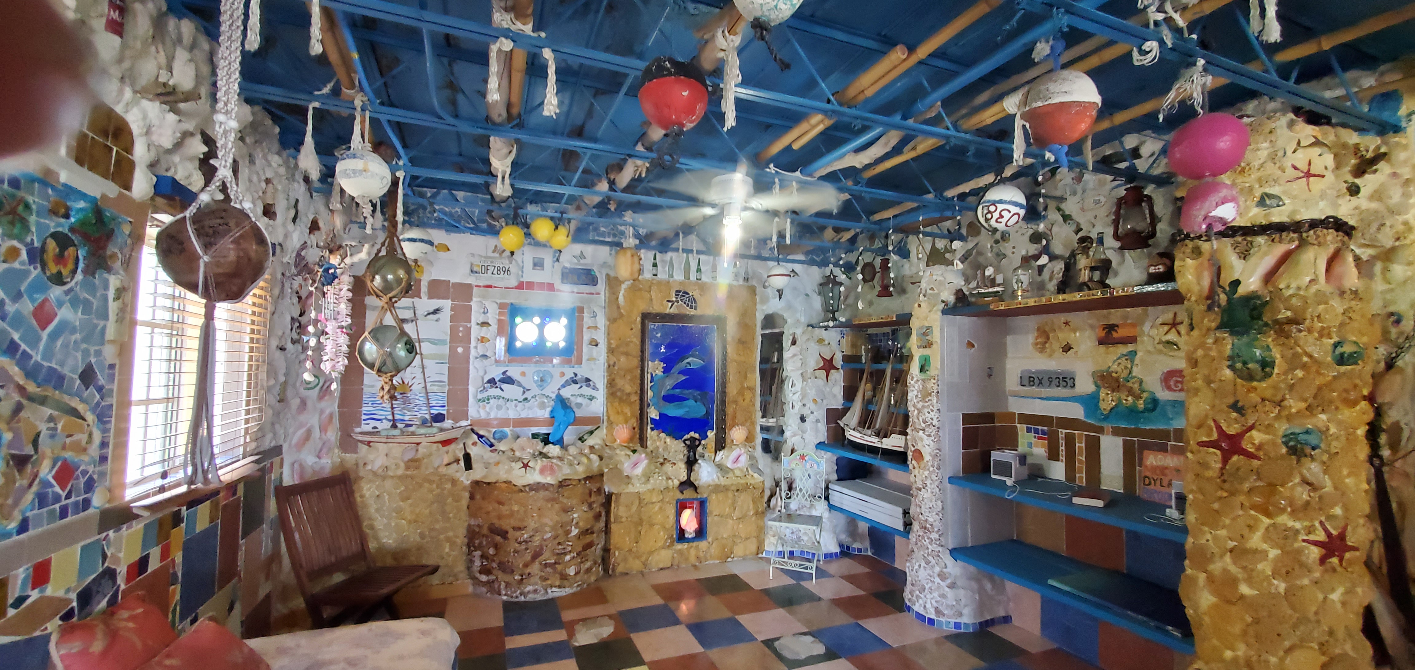 Saunders whose family has lived on Bimini since the American Revolution has built a unique house and a landmark tourist attraction. In 1993, he began construction of a house unlike any other, using found recycled materials to decorate every inch of the concrete structure. The Dolphin House is a thick and sturdy building, purpose-designed to withstand the ugly forces of passing hurricanes, yet also embellished by the careful touches of an artist. The interior and exterior walls are completely covered in mosaics composed of colorful tiles, shells, bottles, coins, and all manner of other “found objects“. He has used materials from demolition sites and shoreline cast-offs from various places.