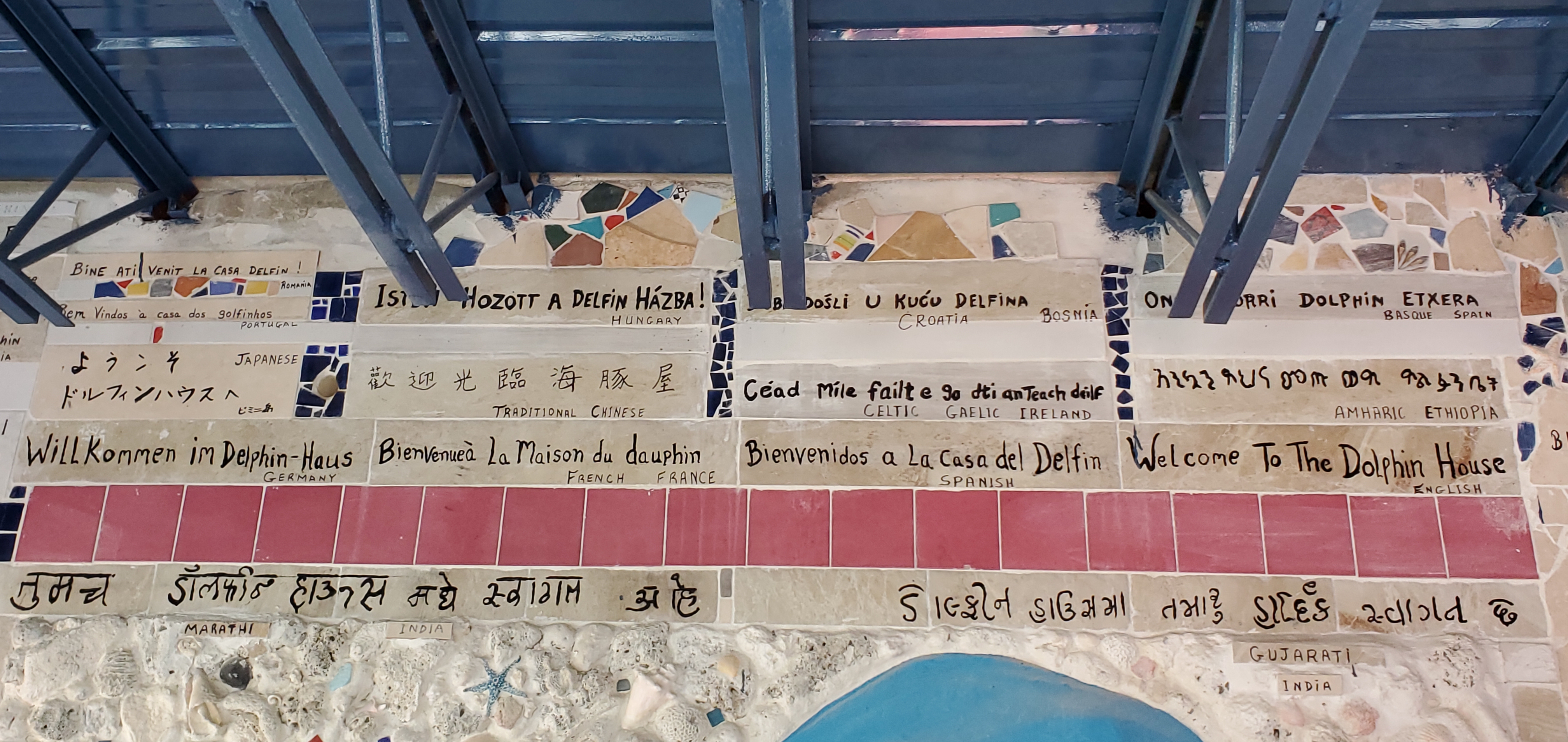 In various places throughout the house, in addition to all the mosaics & dolphin decorations, Ashley had “Welcome to the Dolphin House in over 100 languages (shown below). He had license plates from every state in the USA embedded into the walls, there were sea shells embedded into the corners of each room, there were dollar bills from over 100 countries epoxied to tables. For a “Dolphin House”, one got a lot more than just dolphin art. It was a mish-mash of a lot of materials.
