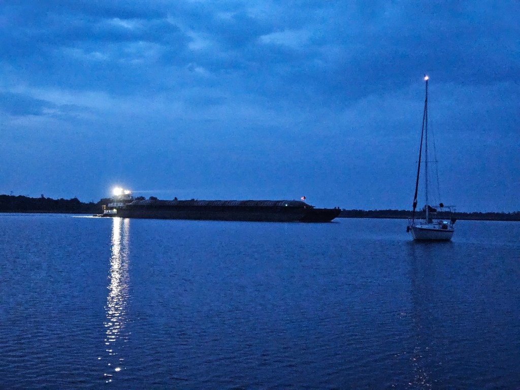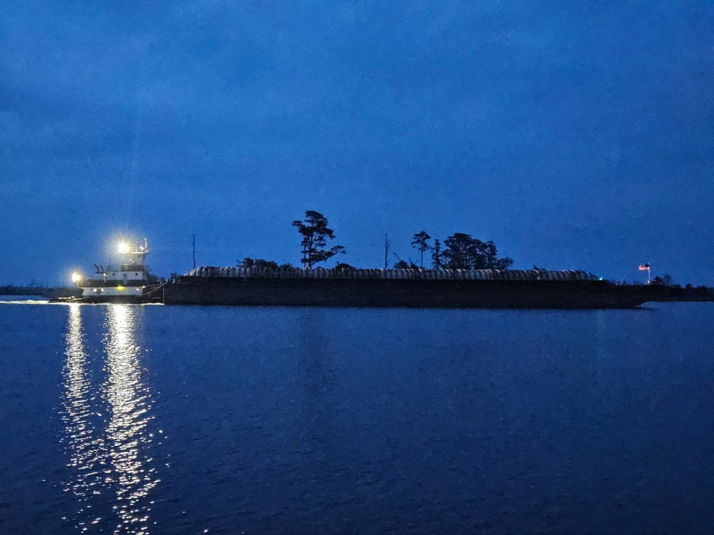 After dinner, just before dark, we were treated to a tug pushing a barge southbound on the ICW.