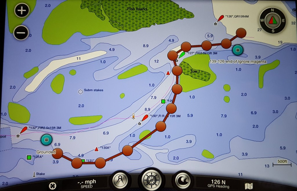 Here is a shot of Red Marker #132 in 2018CY (lower left corner) – The 2 green dots show our boat when we got grounded (left green dot), and after we were towed to true deep water (right green dot). Tow Boat US pulled us thru an area outside of the markers, that the charts said had only 1 ft of water (brown dots). BTW the water is very murky, it’s hard to see the bottom.