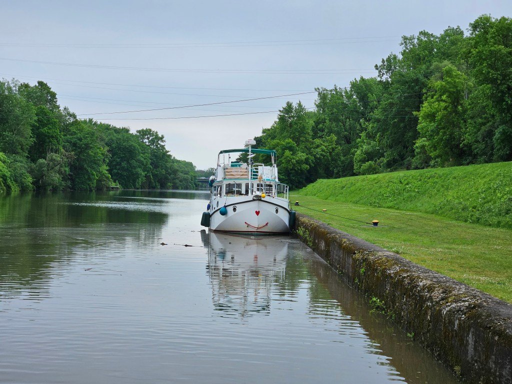 When we arrived at Lock #20 and called the Lock operator for westbound passage, he gave us the BAD NEWS – ALL LOCKS BETWEEN 16-22 are now shut down due to the heavy rains last night.