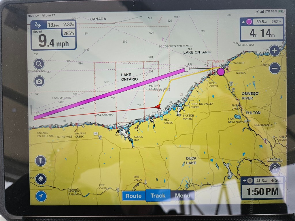 We left Oswego New York today at about 7am. The wind/ waves were predicted to be high, but the wind was from the SE so we figured that we could ride the south shore.