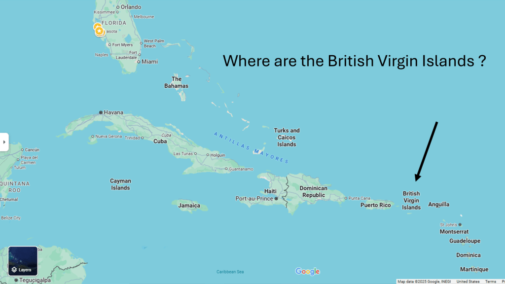 The BVI is located in the Caribbean Sea, just east of Puerto Rico.