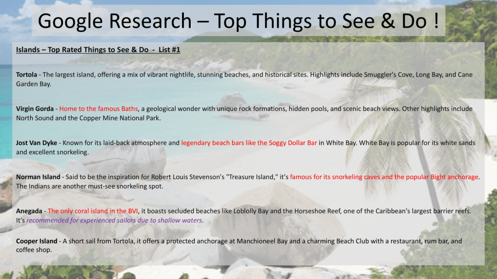 These Blog Posts will show the highlights of our recently completed trip to the British Virgin Islands (BVI) from March 26th – April 3rd.